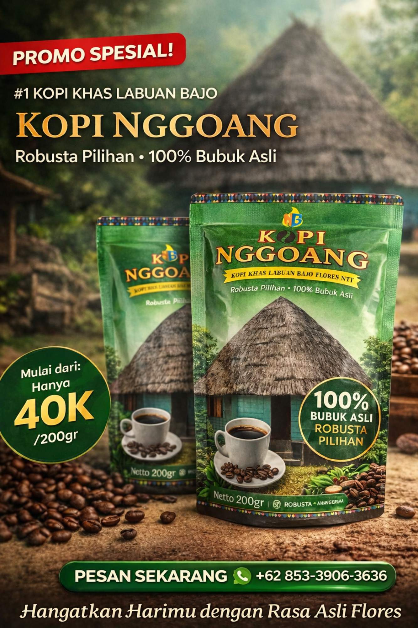 Kopi Nggoang is made from premium Robusta beans, delivering a bold taste, rich aroma, and distinctive character.